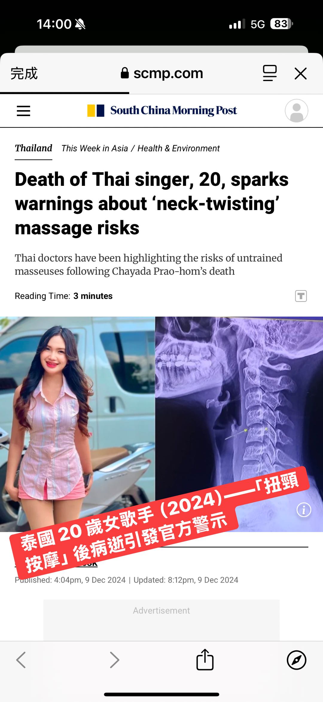 34 歲的模特兒 Katie May,在一次頸部調整後出現頭暈與中風症狀,送醫後不治。法醫最終確認死因是 椎動脈剝離導致的中風。此案轟動全球,也讓更多人開始關注頸椎推拿的風險。
