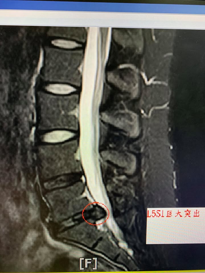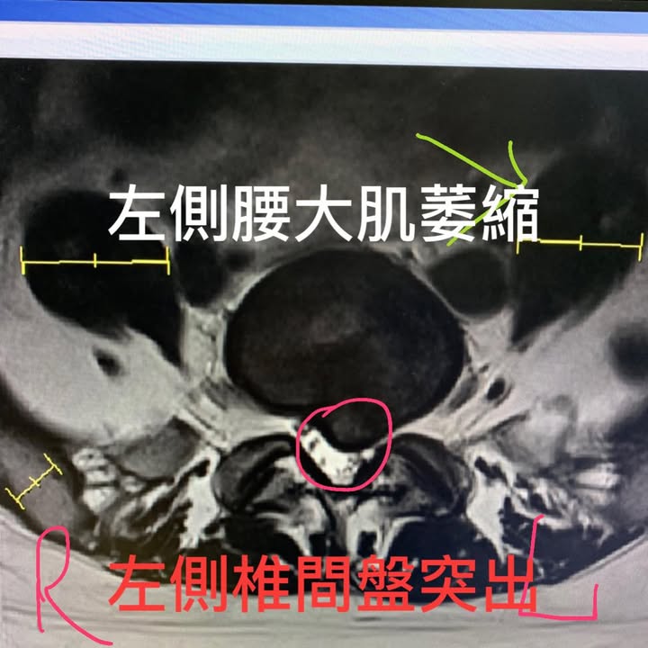 舉個醫案例子,這張照片中可以看到患者左側的腰大肌比右側萎縮不少,結局是腰椎間盤往左側突出,壓迫硬膜囊,不過運氣很好,沒有壓到馬尾神經根,光是這樣的突出已經讓患者腰部大痛到一天要吃到好幾次止痛藥,因為畏懼手術,從宜蘭來台北接受腰椎整合針刀治療,當然身為針刀專科醫師,徐醫師該做的減壓原則上都很有效,患者總是會問如何防患繼續復發這個老問題