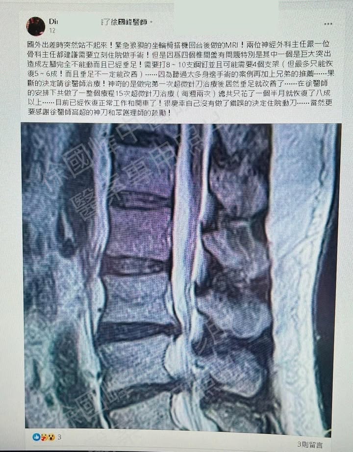 💖來診所治療的第1次,徐醫師就使用上特殊針『屠龍刀』,雖然很痛但神奇的事情發生了,腳垂足活動的幅度竟然能上下活動到二分之一,自己真的嚇到了!!當初大醫院的醫生及身邊的朋友都說垂足就算手術後也不一定能開改善的問題,在徐醫師這裡第一次治療後竟然出現意想不到的美妙奇蹟,後來把原本預約好要手術的所有時間都取消,決定好好在這裡治療。