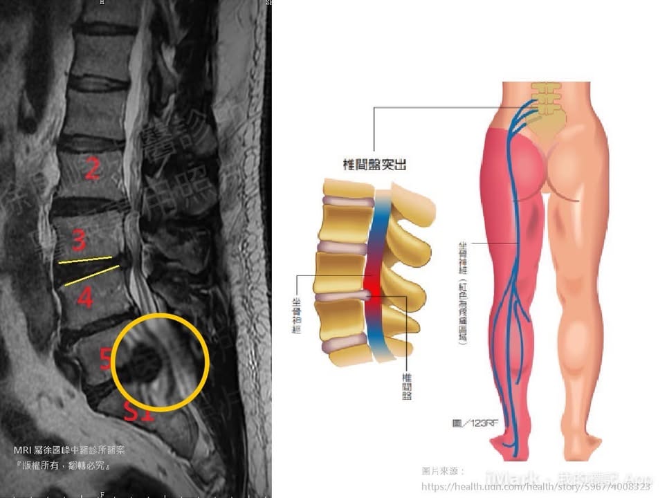 總共突出4節,L5S1的地方突出是最大的,很嚴重卻沒出現大小便失禁,在治療及復健都要比其他患者還努力才有機會康復。