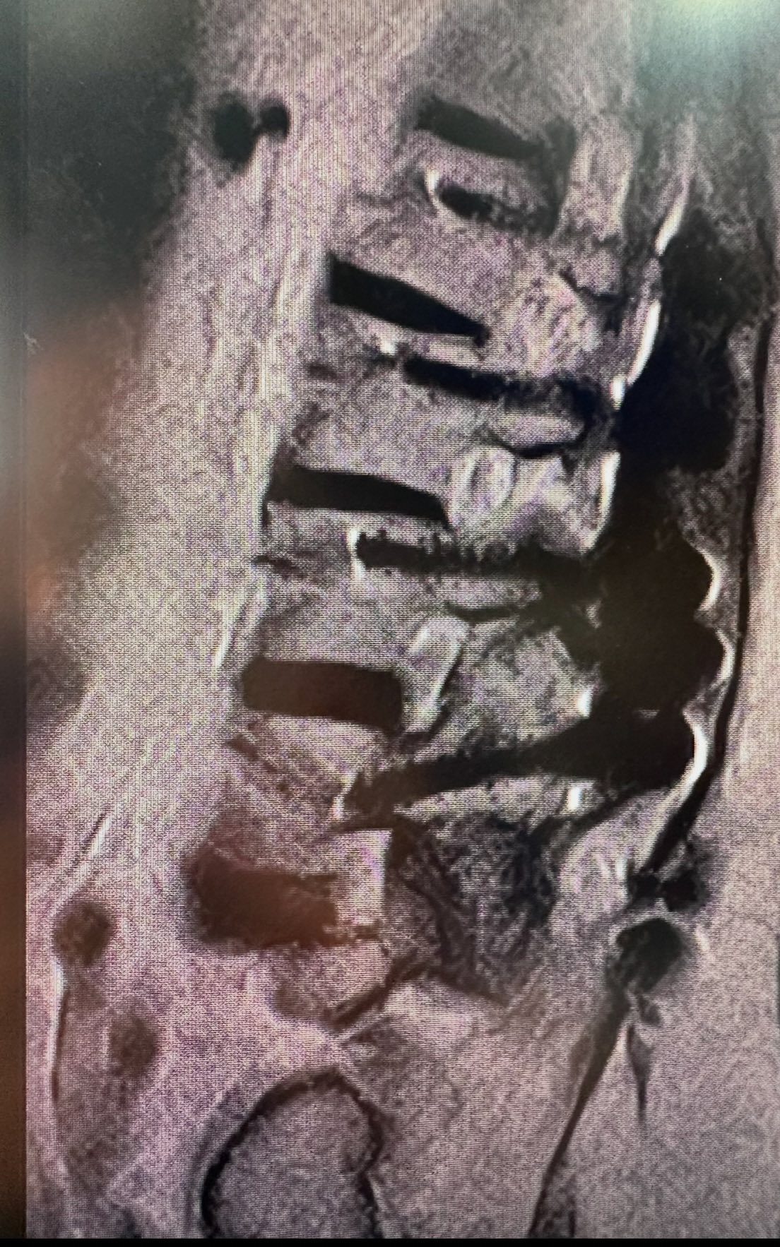X 光片:一排排螺絲與鋼條,延伸自腰椎直至骨盆,這些冰冷的金屬,牢牢固定了他的脊椎,也固定了他五年的痛苦與掙扎。