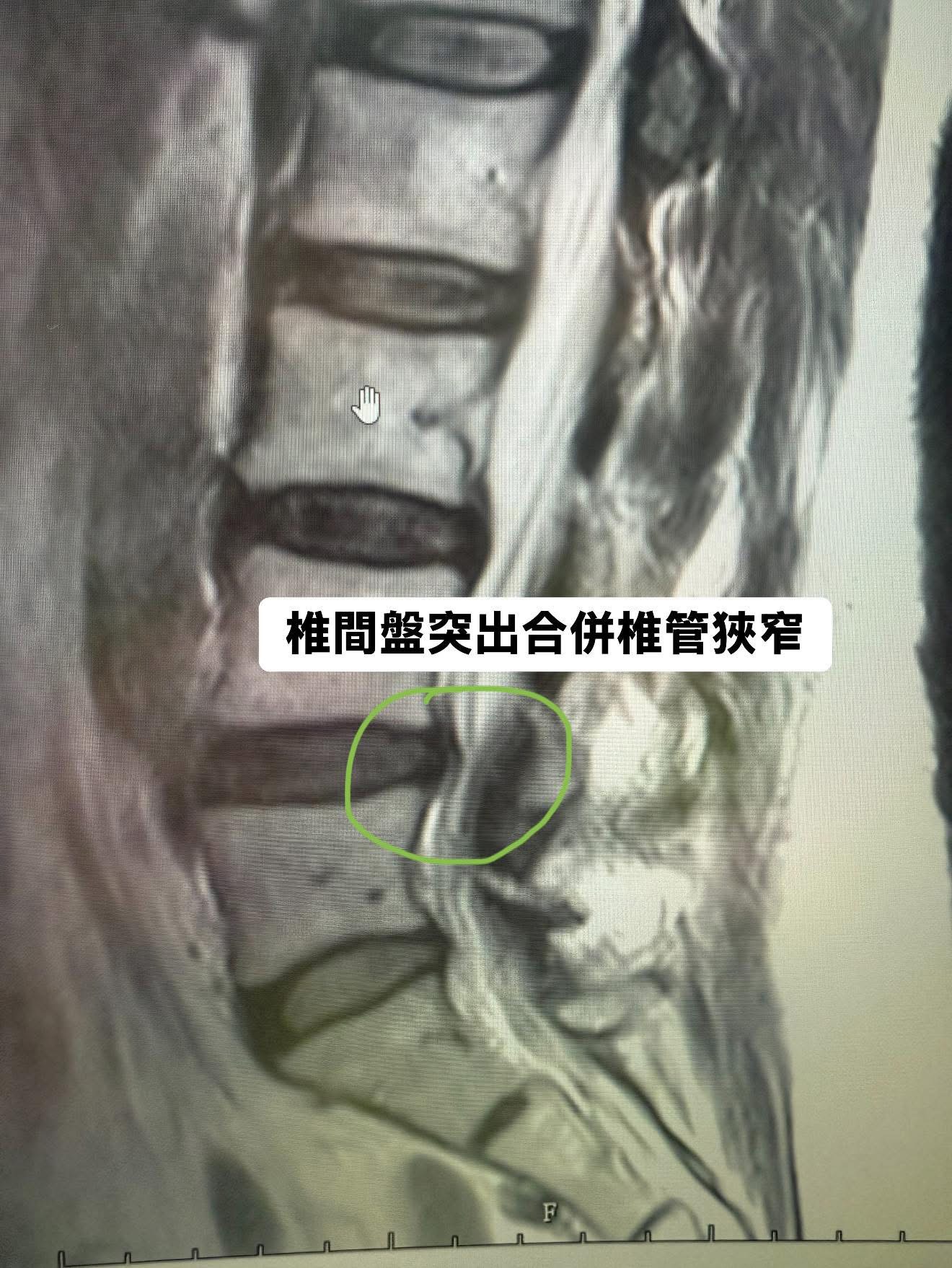 我打開MRI的影像時,心裡已經有底了——這不是單純的肌肉拉傷或一般退化,而是典型的「中央偏左側椎間盤突出壓迫神經根」。