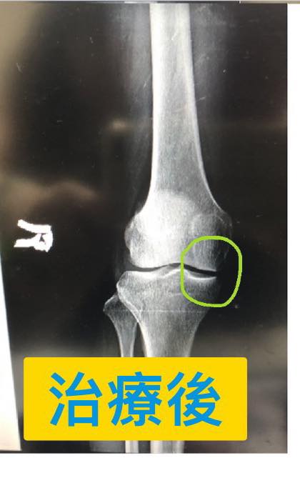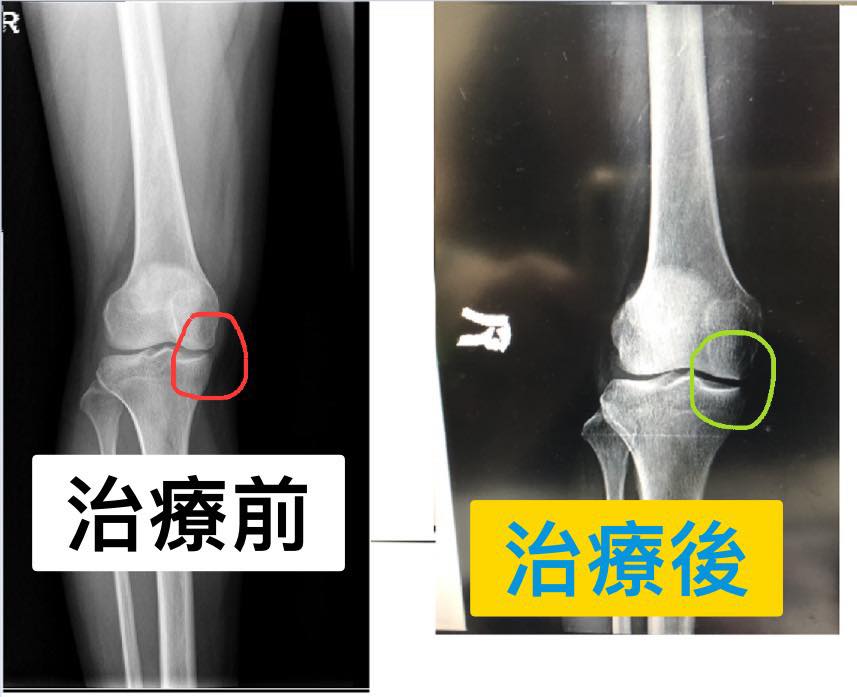 四十多歲的葉小姐抱怨膝蓋疼痛快半年,,最近幾次去跑馬拉松幾乎都跑不完,上下樓梯開始明顯疼痛,就診前拍過X光片可以很清楚的看到膝蓋內側間隙過窄,這大約是退化性膝關節的第二到第三期,經過友人介紹接受膝關節整合治療,大約八週的時間,重新拍片檢查,使用AP VIEW(正位照),兩張照片前後對比可以看到右側膝關節間隙明顯打開,兩張照片脛骨跟腓骨的交會角度幾乎是一樣,股骨跟脛骨的交會角度也是一樣,希望可以排除角度的誤差,不過重點是葉小姐臨床症狀幾乎完全消失!