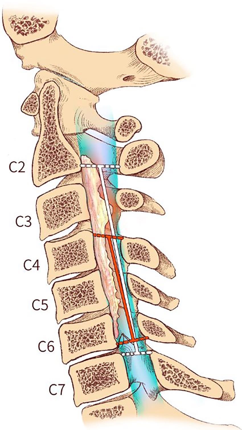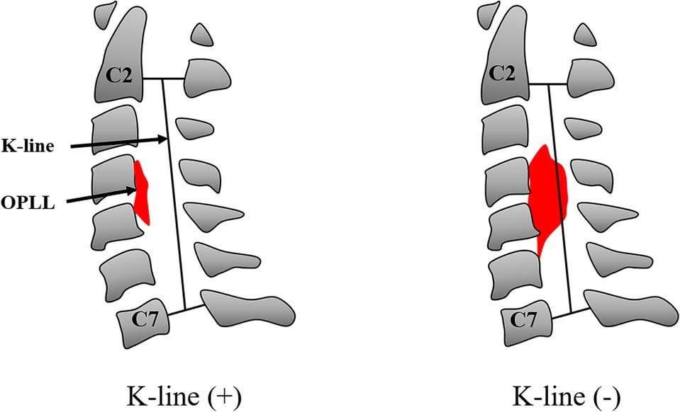 讓我為非醫療背景的粉絲簡單解釋。2008年日本千葉大學骨科的Takayuki Fujiyoshi醫生最早提出了K線這一概念。K線(Kyphosis Line,K line)是頸椎側位X線片上C2與C7椎管中點的連線K-line是一條想像線,從頸椎的第二節連到第七節後緣,用來判斷脊髓受壓的位置是否過深。如果椎間盤突出或骨刺壓迫到這條線的「前方」,我們稱之為K-line Negative,代表壓迫極深,連從後方打開椎板都不一定救得了被卡死的神經。
