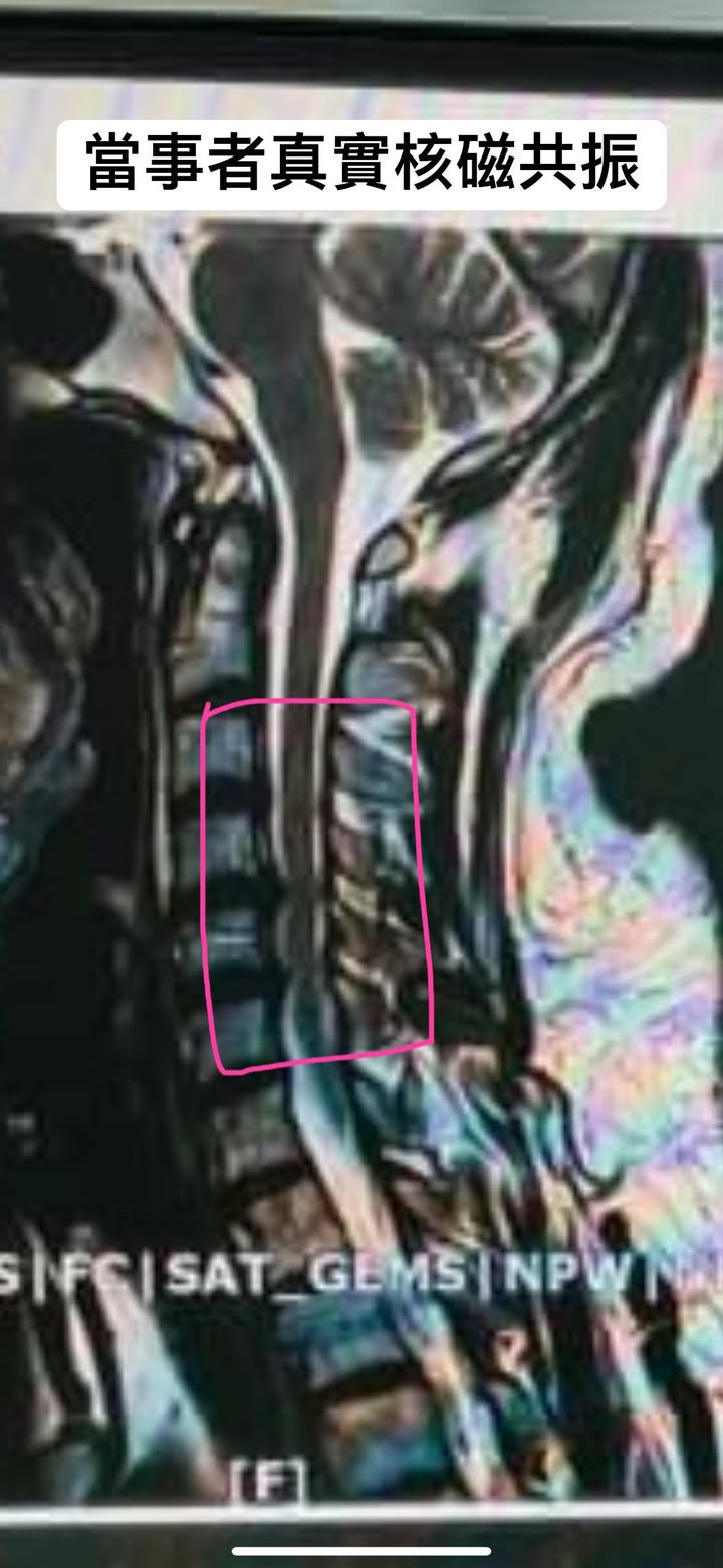 🔹這個患者年紀還不到40歲,最主要會發生這個問題是之前有個外傷將近快七八年前出一場車禍,從那一次就種下一個禍根,到診所的時候除了上半身肩膀的酸痛還有合併咽喉異物感比較奇怪的是患者都不知道為什麼他的雙腳會發軟,去做過腰椎的檢查也都沒事,但是因為當初都沒有拍到最新的核磁共振,結果我們才發現他的頸椎第四第五第六節後縱韌帶已經鈣化!