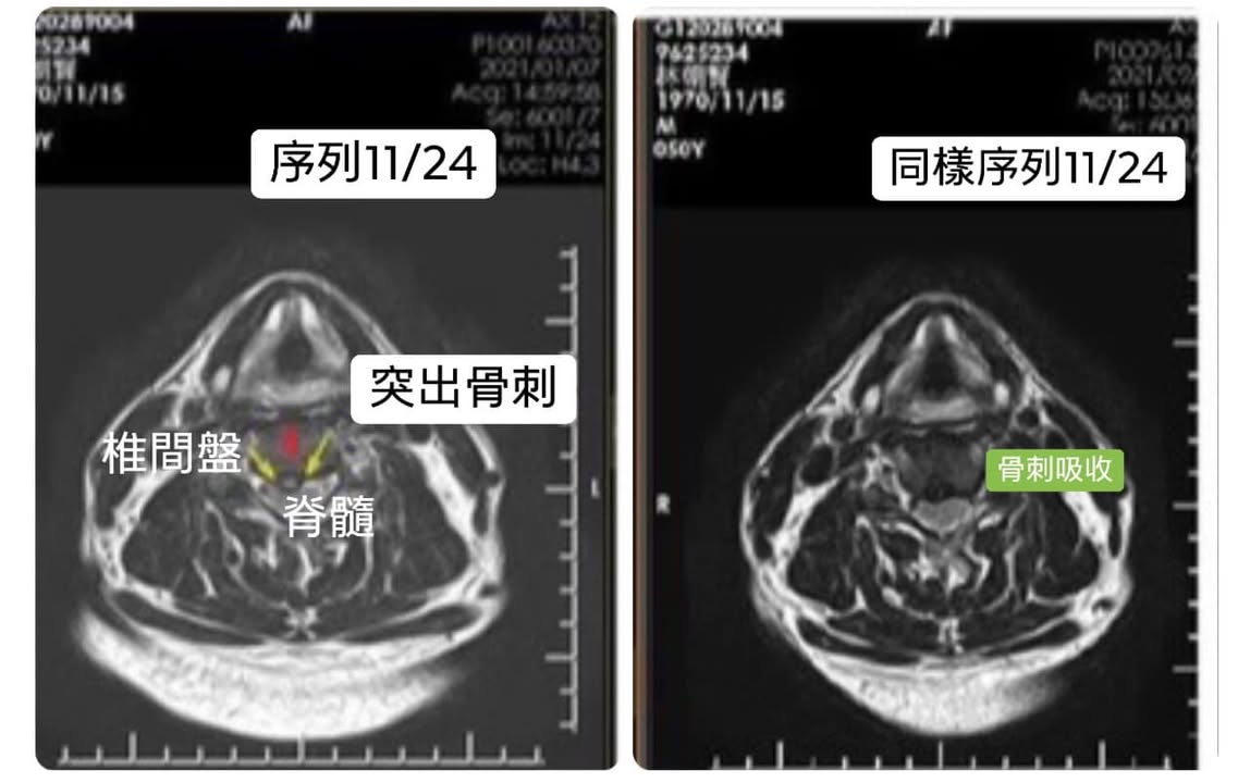 ❗️回診:從1/7治療到四月底,症狀已經全部消失,碰到疫情,一直無法回醫院拍攝MRI,九月多回醫院拍攝核磁共振,發現頸椎骨刺有吸收現象,不管是種旗面跟橫切面都看到效果,非常難能可貴