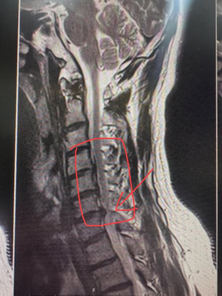 • 第二張影像中特寫展示了可能的椎間盤突出,特別是在C5-C6和C6-C7處,這些部位的椎間盤突出可能引起脊髓或神經壓迫,進而導致臨床症狀。