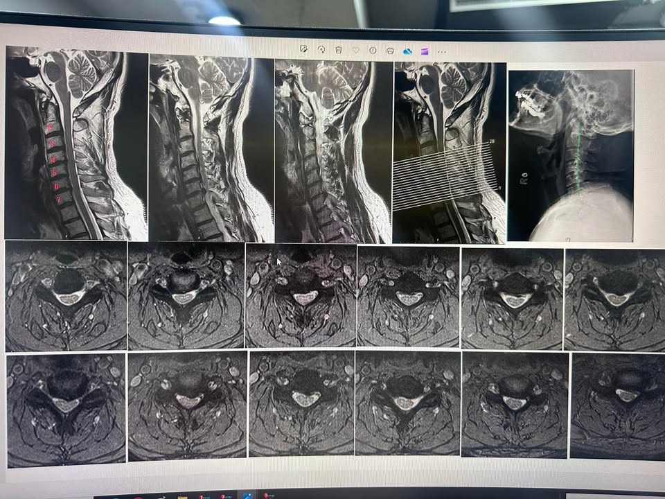 • 下方的橫切面影像展示了不同高度的頸椎橫斷面。可以看到在部分影像中,C6/C7明顯脊髓周圍的空間變窄,因為椎間盤突出或骨質增生導致的脊椎管狹窄。