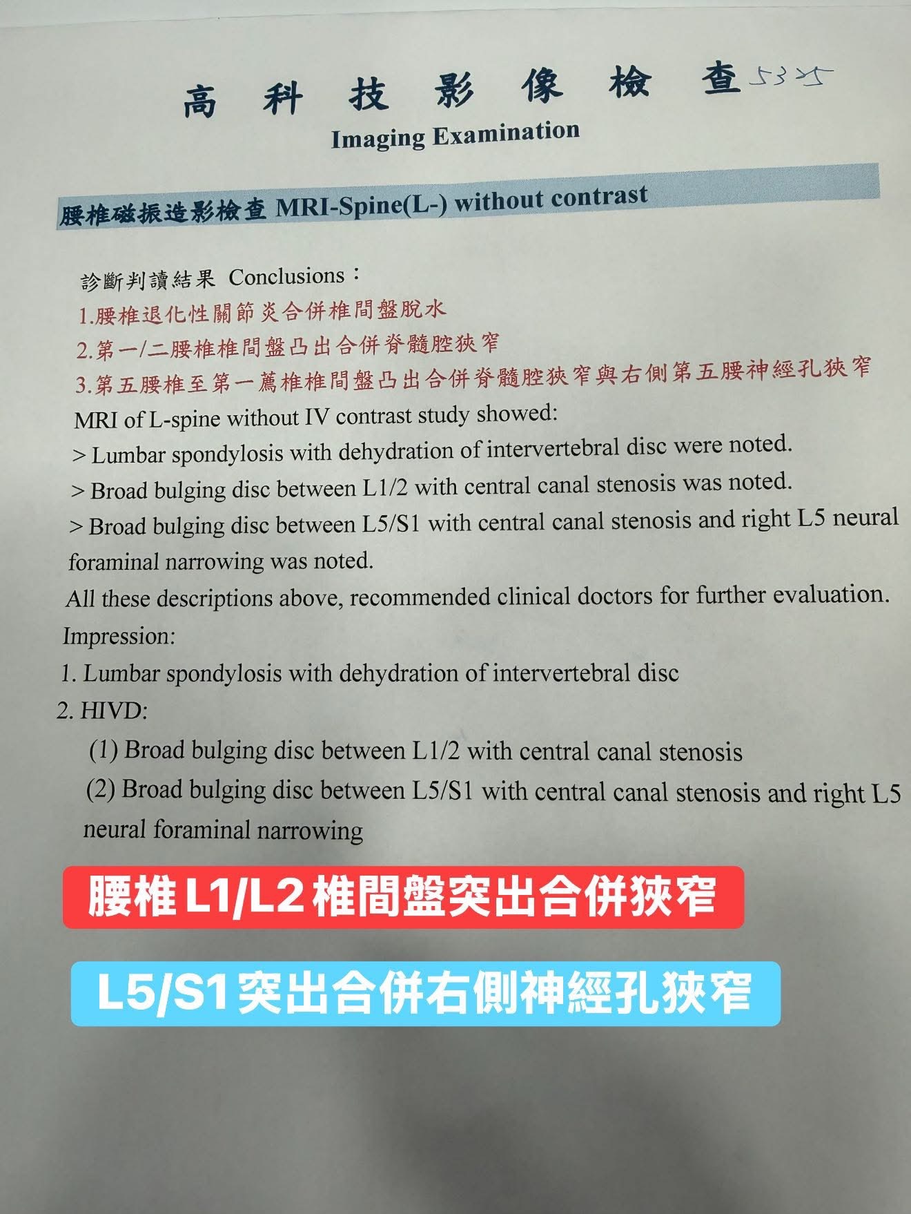 在診間,我們替他安排了完整的脊椎核磁共振影像檢查。結果顯示,他的 腰椎第一節與第五節,都有明顯的椎間盤突出。