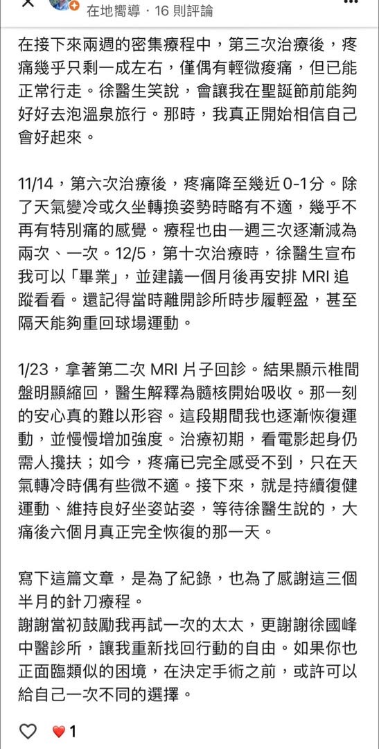 治療過程並非一帆風順。第一次治療後他能穩健行走,但隨後因過度復健產生反跳痛,他絕望地爬行進診間。我蹲下拍拍他肩膀:「兄弟,這是最後的陣痛,哥一定把你救回來!」 我採取側躺體位,利用針刀深入最頑固的沾黏區。當晚,他已能扶牆行走;隔天,疼痛降至五成,在去年聖誕節前他所有的疼痛都已經消失九成以上我就讓他畢業了。